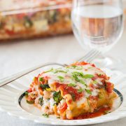 Spoon 1 Tbsp of the red sauce evenly over veggies (along length of lasagna). Roll lasagna up, while covering sides as needed to prevent filling from spilling out sides (they will be pretty full). Transfer to baking dish placing roll ups side by side.