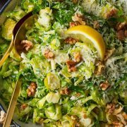 Brussels sprouts are thinly shredded for a crisp tender texture, and they're tossed with walnuts, romano cheese and a bright lemon dressing. A delicious autumn salad recipe!