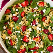 In a salad bowl gently toss together spinach, strawberries, green onions, almonds, and ramen. Add goat cheese and give it another light toss. Pour dressing over top and serve immediately after adding dressing (or plate and add dressing to individual portions).