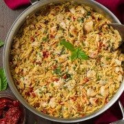 Sun Dried Tomato Basil and Parmesan Orzo with Chicken