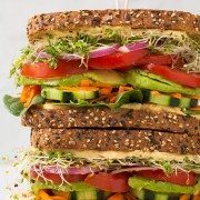 A healthy, hearty, delicious sandwich! A great way to eat lots of vegetables at once! Whole grain bread is layered with fresh hummus, spinach, cucumber, avocado, tomato, red onion, sprouts and cheese.